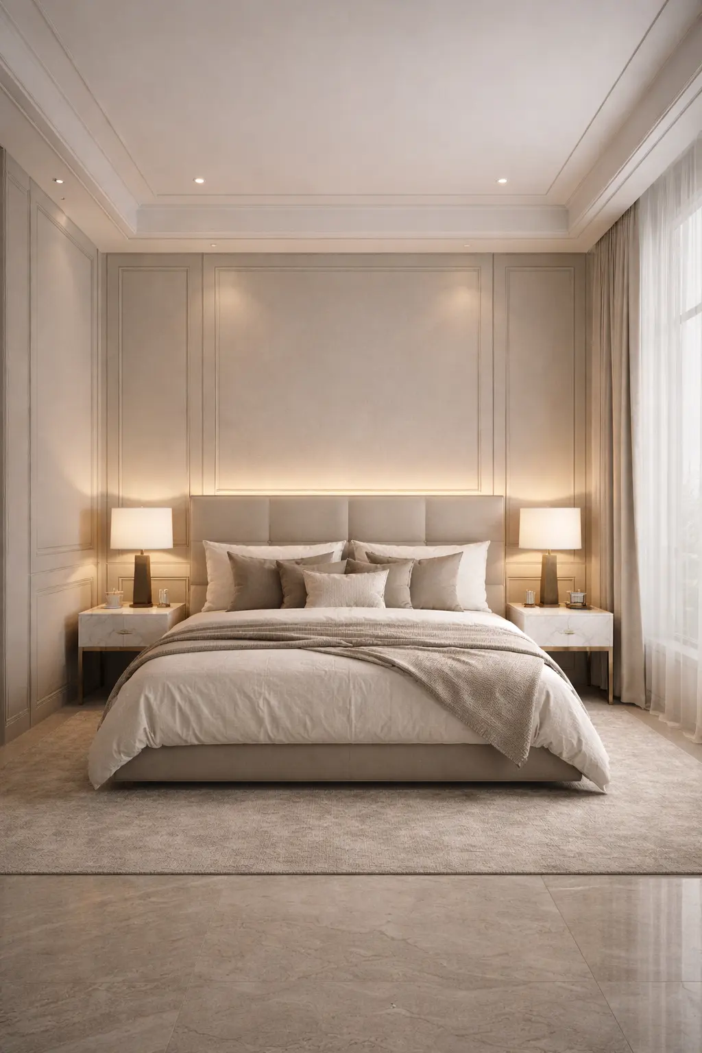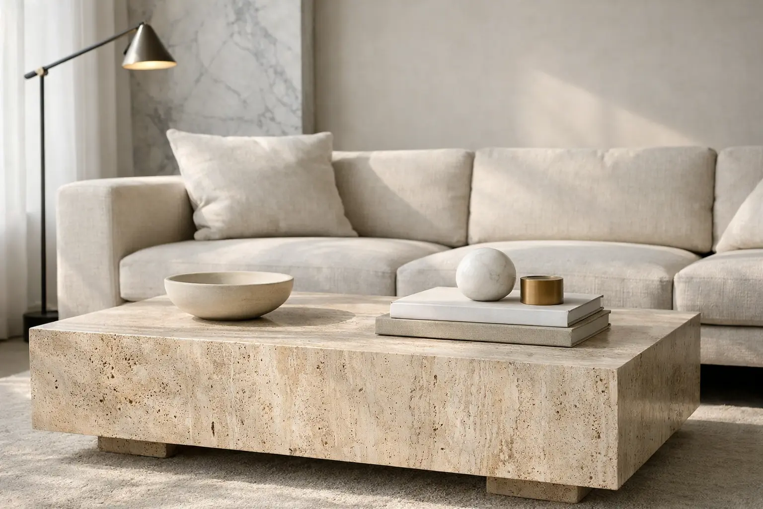Custom-designed upholstery in neutral tones creates a soft yet structured silhouette, balancing modern minimalism with everyday comfort.Textured Stone Accent