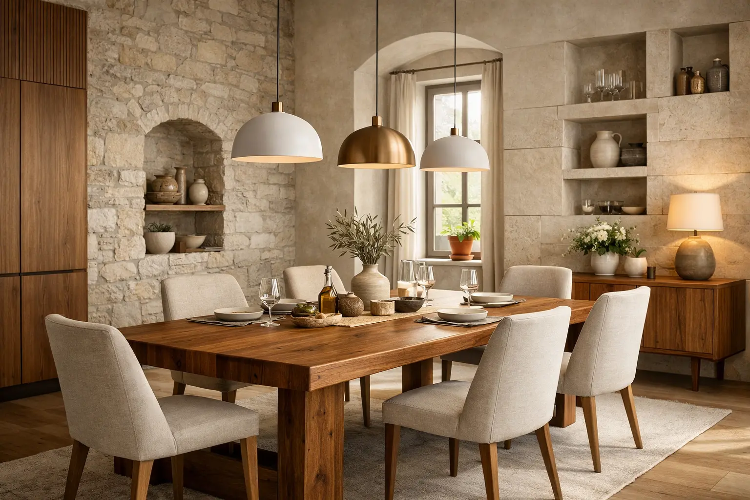 Hand-selected natural stone adds warmth and depth, introducing organic character that elevates the entire interior aesthetic.