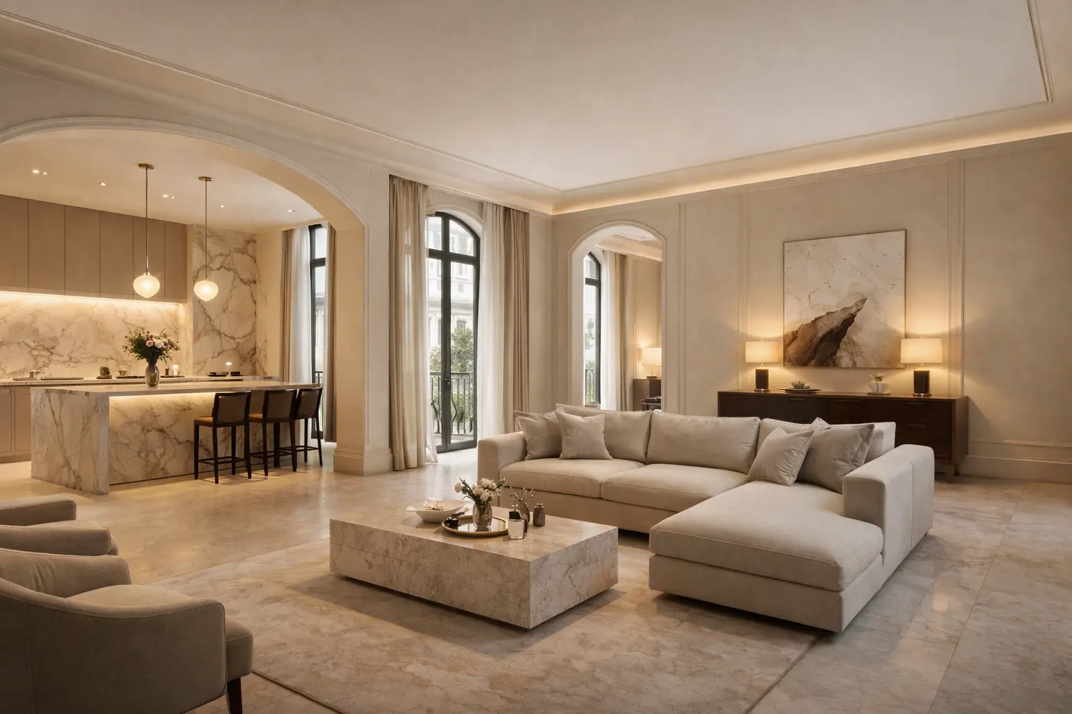 Integrated recessed lighting enhances spatial depth while creating a calm, layered atmosphere throughout the living area.